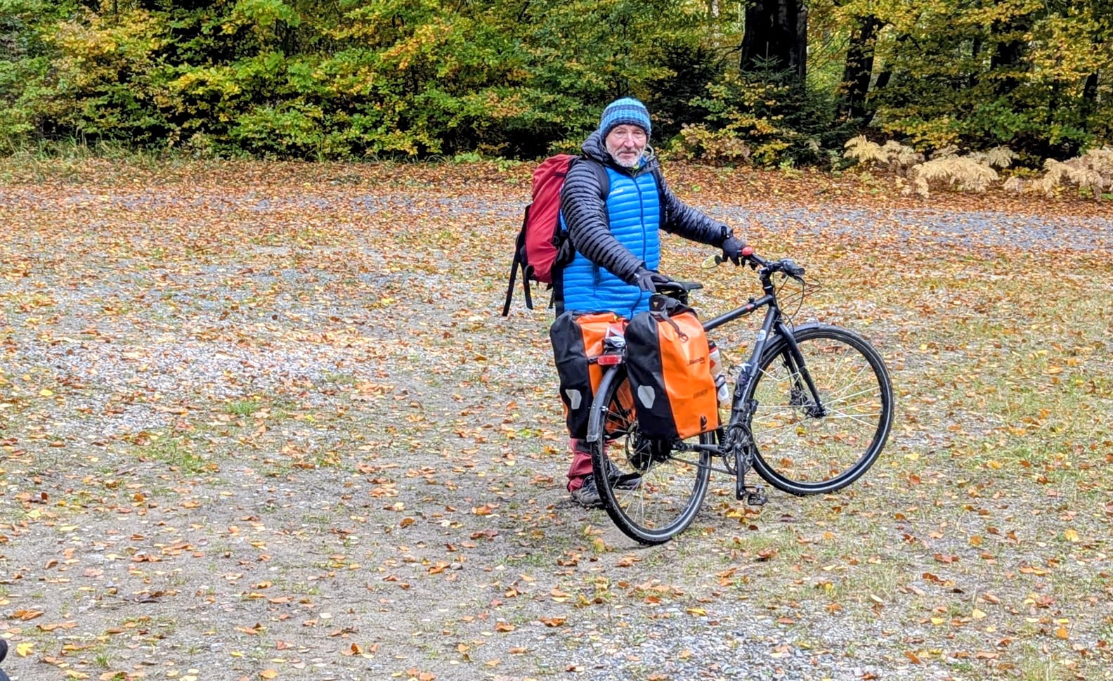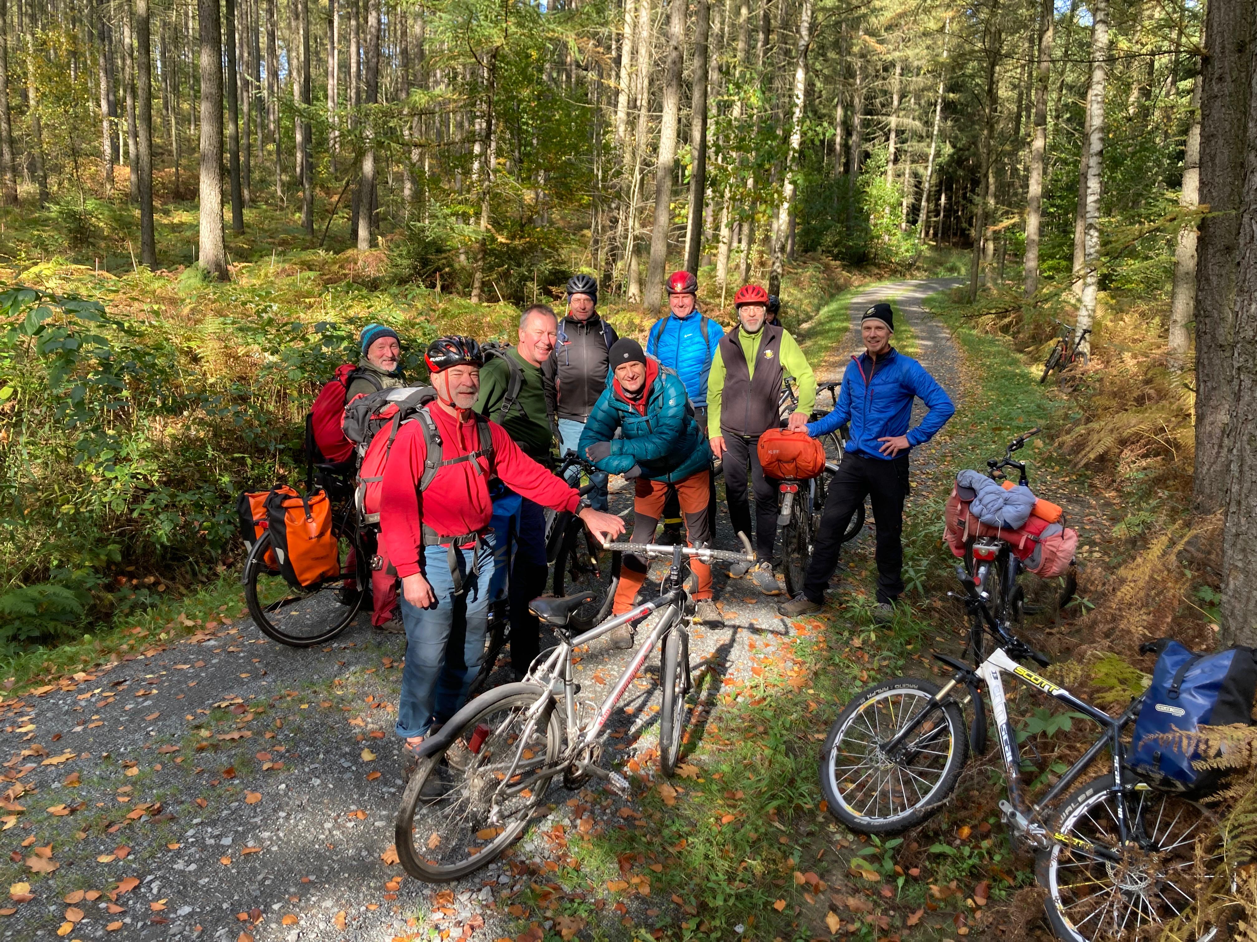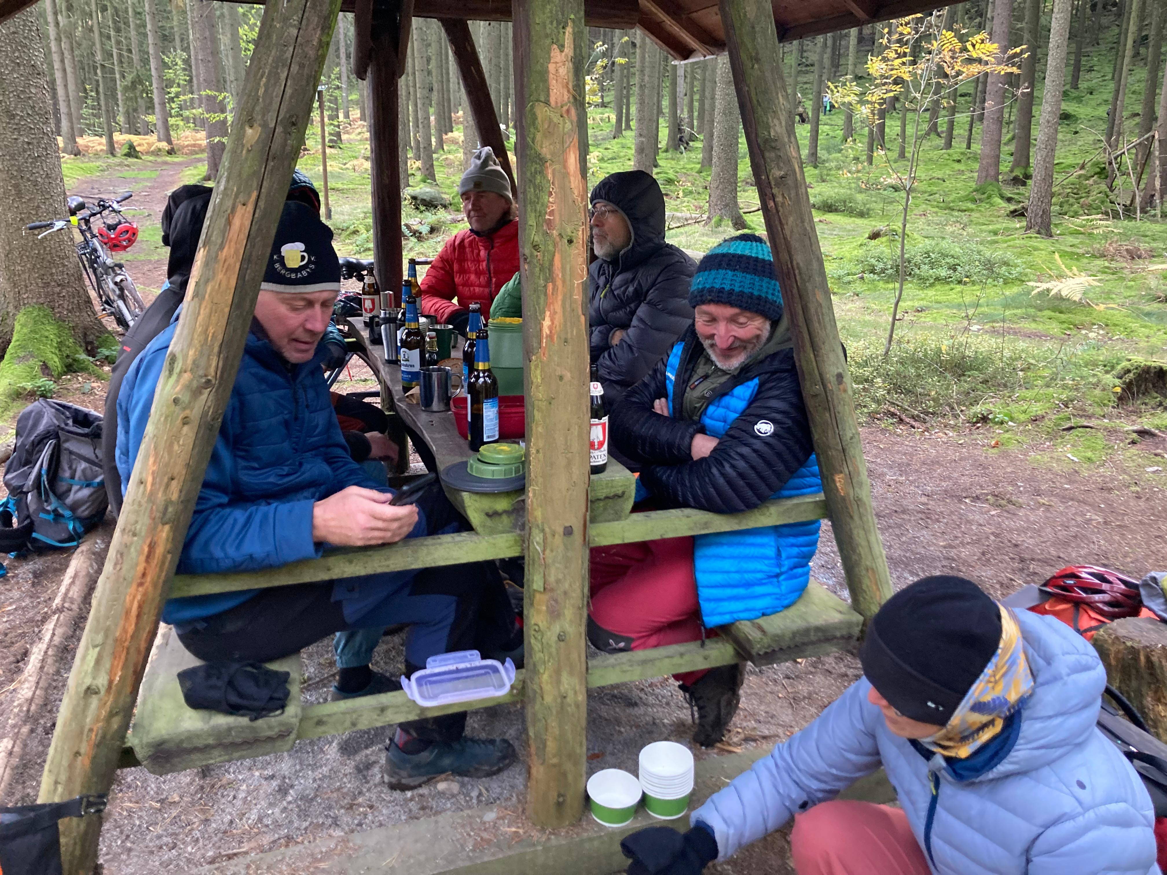 Wir trafen uns in erfreulich großer Runde um 9:30 Uhr auf dem privaten Parkplatz von Jürgen Jakob und bereiteten unseren Ausflug ins hintere Bielatal gründlich vor. Die Temperaturen waren merklich frisch und der Himmel bewölkt. Trotzdem reichte ich die flüssige Marschverpflegung aus der Kühlbox aus. Einige gönnten sich zwei Portionen, andere begnügten sich mit einer Einheit von Landskron. Nachdem die Luftdruckeinstellungen der Mieträder von Glatze und Silke korrigiert waren, konnten wir endlich losradeln. Die ganze Zeit bergauf zu fahren und gleichzeitig Gespräche zu führen, war ganz schön anstrengend.